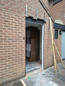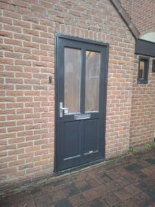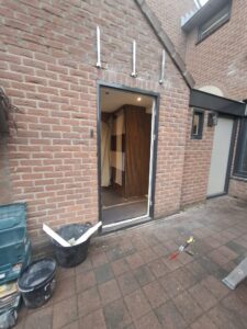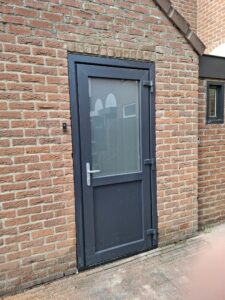Ik kreeg een mail van mensen bij mij uit de wijk die via-via van me hadden gehoord. Hun woning had een gang tussen de woning en de schuur. De buitenmuur hiervan was halfsteens en de bestaande houten deur was deels verrot en aan tocht onderhevig. Na overleg hebben we hier een offerte mogen maken voor een kunststof buitendeur. De klant heeft hiervan eerst een voorbeeld ontvangen voordat deze besteld werd. De deur is naar wens geplaatst en de binnenzijde is weer netjes afgewerkt en gestuct.