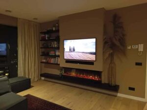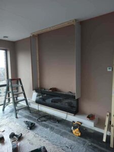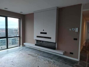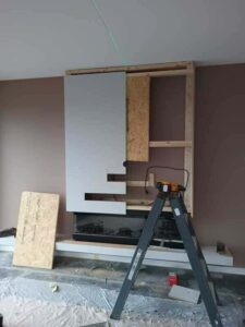 Deze cinewall hebben we geplaatst voor de nieuwe bewoners van een penthouse. Deze mensen hadden in hun bestaande woning reeds een cinewall en ze wilden graag exact dezelfde in hun nieuwe woning. Ook moest de sfeerhaard hierin weer in worden gebouwd. De oude cinewall was niet te demonteren dus dit was een kwestie van, opmeten, slopen en opnieuw realiseren. Deze cinewall is gemaakt van houten regelwerk afgewerkt met mdf plaatwerk. De klant heeft het schilderwerk zelf uitgevoerd.