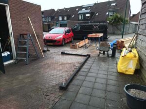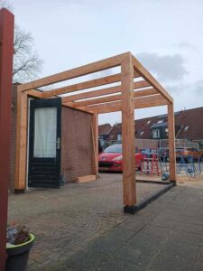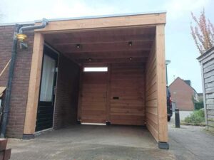 Bij deze klant had ik al eerder werkzaamheden verricht in de woning. Hier hadden we namelijk extra kamers gecreëerd. Voor nu mochten we een offerte uitbrengen voor een overkapping aansluitend aan de schuur. Zo hadden ze een droge plek waar ze de fietsen neer kunnen zetten en meteen een plekje waar ze de frituurpan buiten kunnen gebruiken. Van Douglas hout hebben we deze overkapping gemaakt. Afgewerkt met epdm dakbedekking, spotjes en zwarte elektra garnituur.