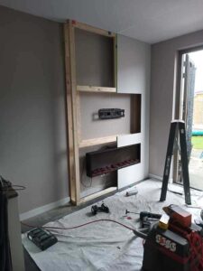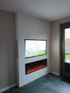 Deze cinewall is in de plaats gekomen van een dressoir. Het bestaande dressoir nam naar wens teveel ruimte in in de woonkamer. Daarom hebben we deze cinewall zo slank mogelijk uitgevoerd, compleet met sfeerhaard en een televisiebeugel. Aan de zijkant van deze cinewall hebben we 2 vakjes gemaakt waar ruimte is voor de spelcomputers van de kinderen. Zo zijn deze goed te gebruiken en toch zijn de controllers goed op te bergen en is de bedrading netjes weggewerkt.